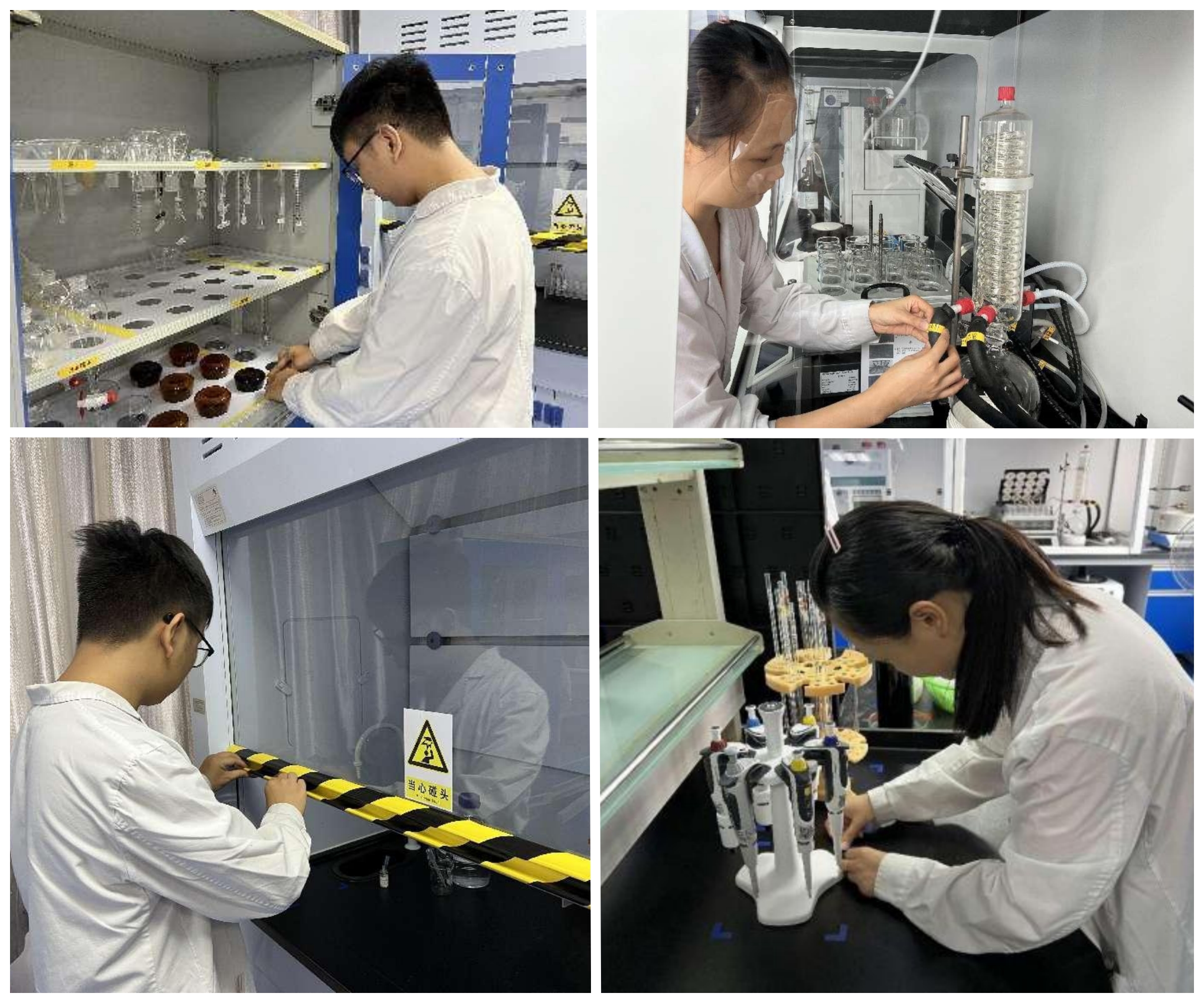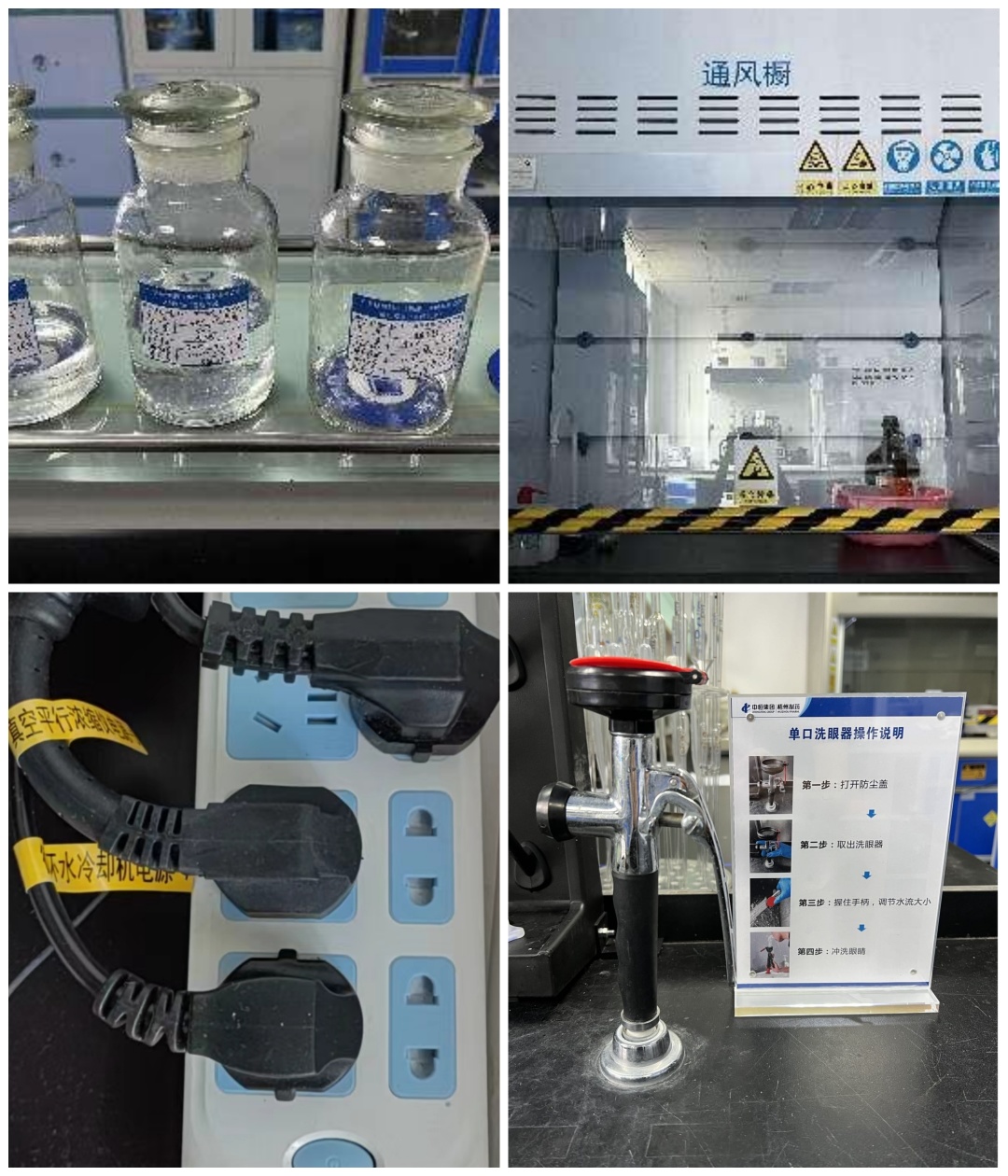 安全是企業(yè)的生命。實(shí)驗(yàn)室內(nèi)存放的試劑、各種檢驗(yàn)操作均存在一定的風(fēng)險,做好安全警示,既是保證安全檢驗(yàn),也是人員健康的一大保障。將試劑按酸(紅)、堿(黃)、普通(藍(lán))、有毒(黑)分類標(biāo)識,標(biāo)識后試劑屬性及風(fēng)險清晰明了。在通風(fēng)櫥增加黃黑警示線及安全警示標(biāo)示等,提醒人員做好安全防護(hù)。梳理管道、電源線走向與標(biāo)識,在緊急狀態(tài)下能快且準(zhǔn)地拔插頭斷電。應(yīng)急處理的洗眼器旁放置操作方法標(biāo)示,便于緊急狀況下的準(zhǔn)確操作。這一系列舉措極大提高了檢驗(yàn)工作的安全性。