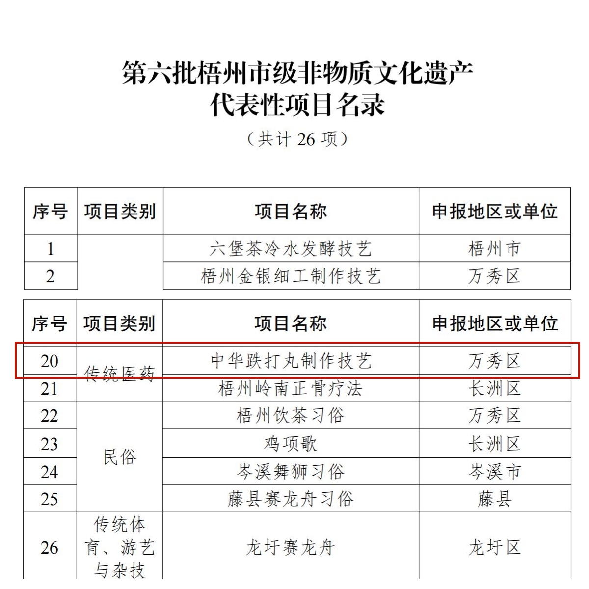 近日,梧州市人民政府公布了梧州市第六批非物質(zhì)文化遺產(chǎn)代表性項(xiàng)目名錄,梧州制藥的中華跌打丸制作技藝項(xiàng)目成功入選。