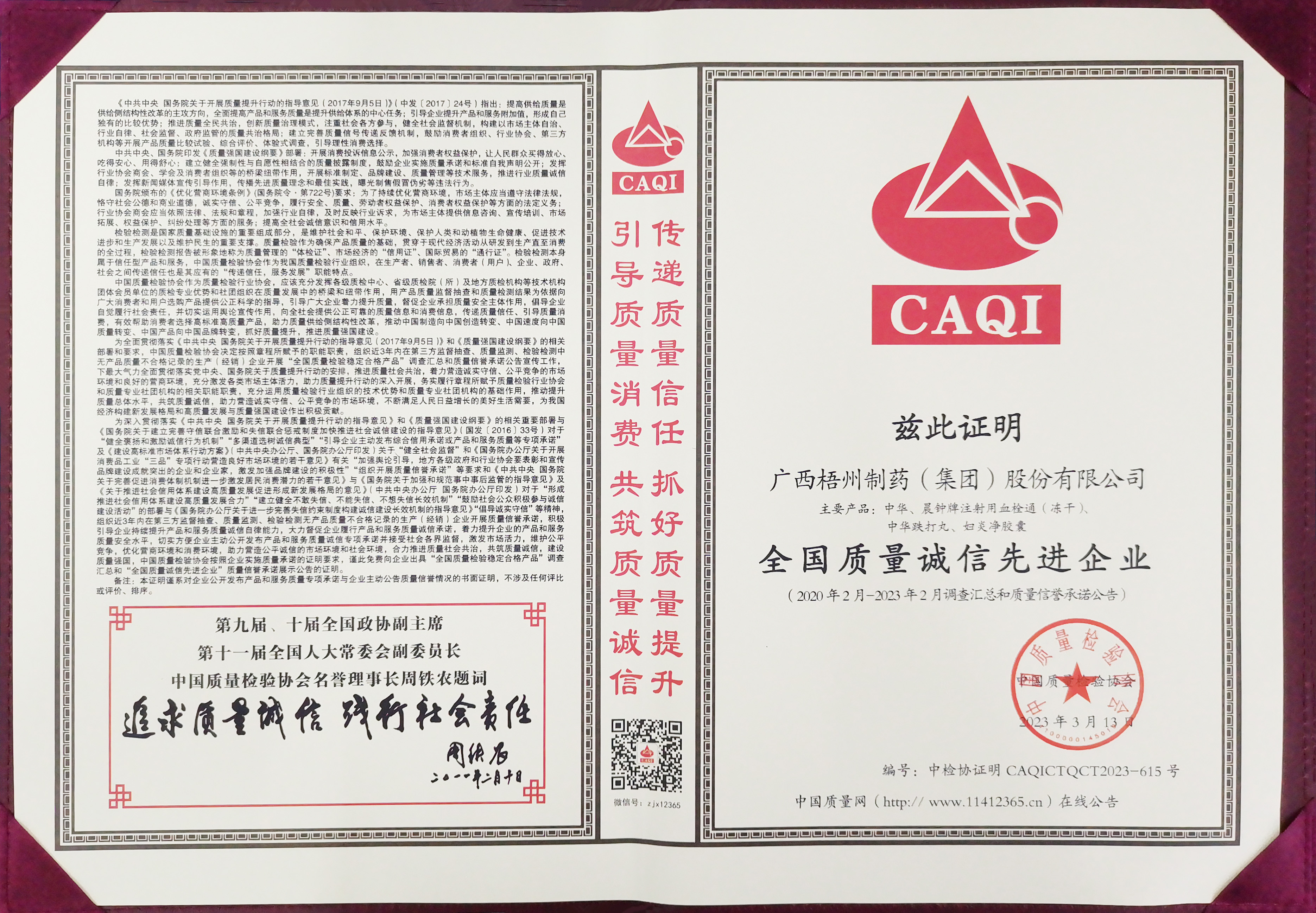 廣西梧州制藥(集團(tuán))股份有限公司榮獲2023年全國質(zhì)量誠信先進(jìn)企業(yè)