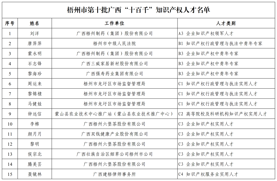 此次入選第十批廣西“十百千”知識產(chǎn)權(quán)人才名單,不僅是對兩名同志在知識產(chǎn)權(quán)領(lǐng)域所取得成績的肯定,更是對梧州制藥近年來深入貫徹廣西知識產(chǎn)權(quán)“十百千”人才工程建設(shè)要求,積極打造高素質(zhì)專業(yè)化的知識產(chǎn)權(quán)人才隊伍的認可和鼓勵。
