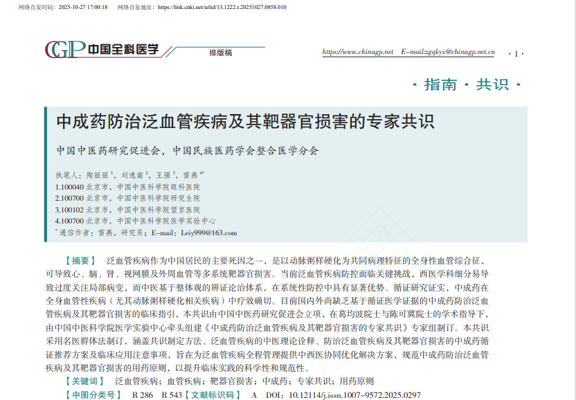 此次發(fā)布的專家共識(shí),由葛均波院士、陳可冀院士擔(dān)任學(xué)術(shù)指導(dǎo),匯聚了43位來(lái)自全國(guó)19個(gè)省、自治區(qū)、直轄市,專業(yè)領(lǐng)域覆蓋心血管、腦血管、腎臟、眼、外周血管及內(nèi)分泌等泛血管疾病核心方向的權(quán)威專家。