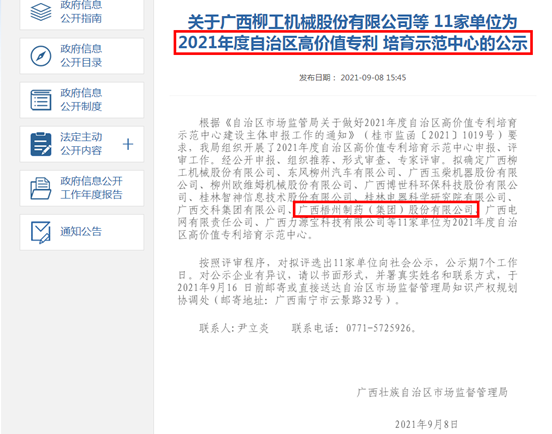 近期,廣西壯族自治區(qū)市場監(jiān)督管理局發(fā)布關于2021年度自治區(qū)高價值專利培育示范中心的公示名單,梧州制藥被確定為2021年度自治區(qū)高價值專利培育示范中心。建設高價值專利培育示范中心,